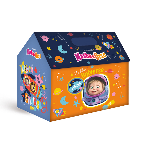 Una nuova linea di articoli è arrivata, le colorate e ricche Casette. Con la casetta di Masha e Orso all’interno potrai trovare un album activity, dei morbidi portachiavi peluche, palla di Masha, gomme da cancellare e da collezionare dei coloratissimi antistress.